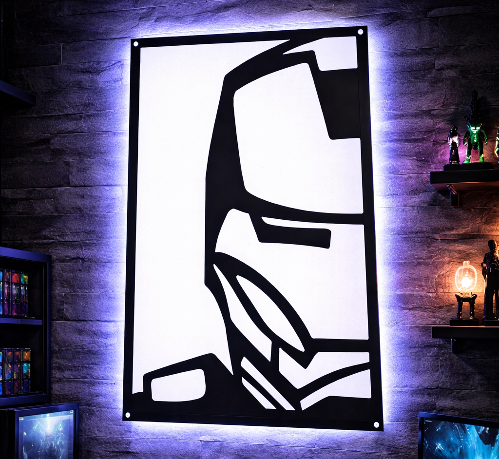 Just like a state-of-the-art suit, this piece is practically built for upgrades. By simply adding your own RGB LED strips behind the metal frame (as shown in the display image), you can instantly transform this artwork into a glowing, futuristic focal point that elevates any gaming room, home theater, or workspace. Finished in a premium, rust-resistant matte black coating, it is a durable and striking tribute to pop culture and modern industrial design.