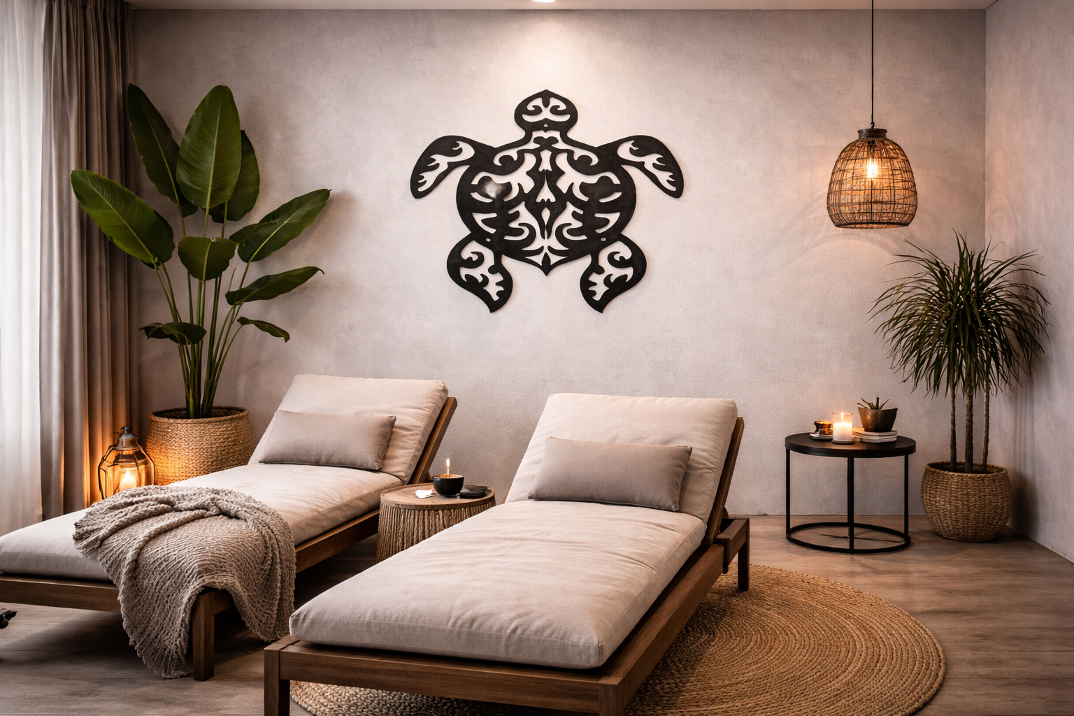 Expertly laser-cut from high-grade steel, this piece combines the beloved silhouette of a sea turtle with beautiful, flowing tribal tattoo patterns. The intricate cutouts allow your underlying wall color to peek through, creating a dynamic, textured look that perfectly balances organic wildlife with sharp, modern precision.